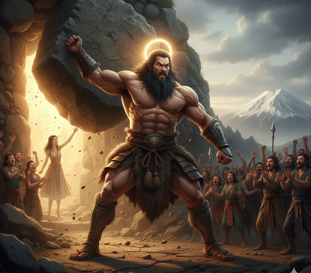 天手力男(アメノタジカラオ)の名は「天上界で最も手の力が強い男」という意味で、その名があらわす通り、肉体的な力は凄まじく天岩戸の話においてはアマテラスが外の様子をうかがう為に岩戸の扉を微かに開けた瞬間、岩戸の扉に手をかけて一気に開放し、中にいたアマテラスの手を引いて外へ導き出したと言われています。