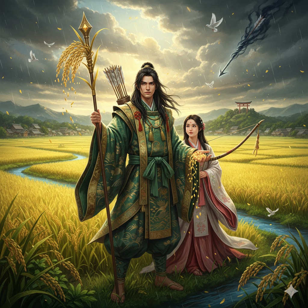 アメノワカヒコは高天原のアマテラスおよびタカミムスビから「地上の荒ぶる神々を平定せよ」という名を受けて地上に派遣されましたが、地上で出会ったオオクニヌシの娘であるシタテルヒメと恋に落ち、使命を放棄してしまいます。