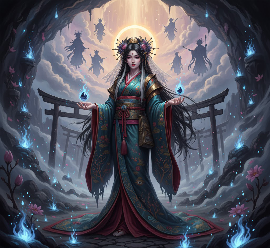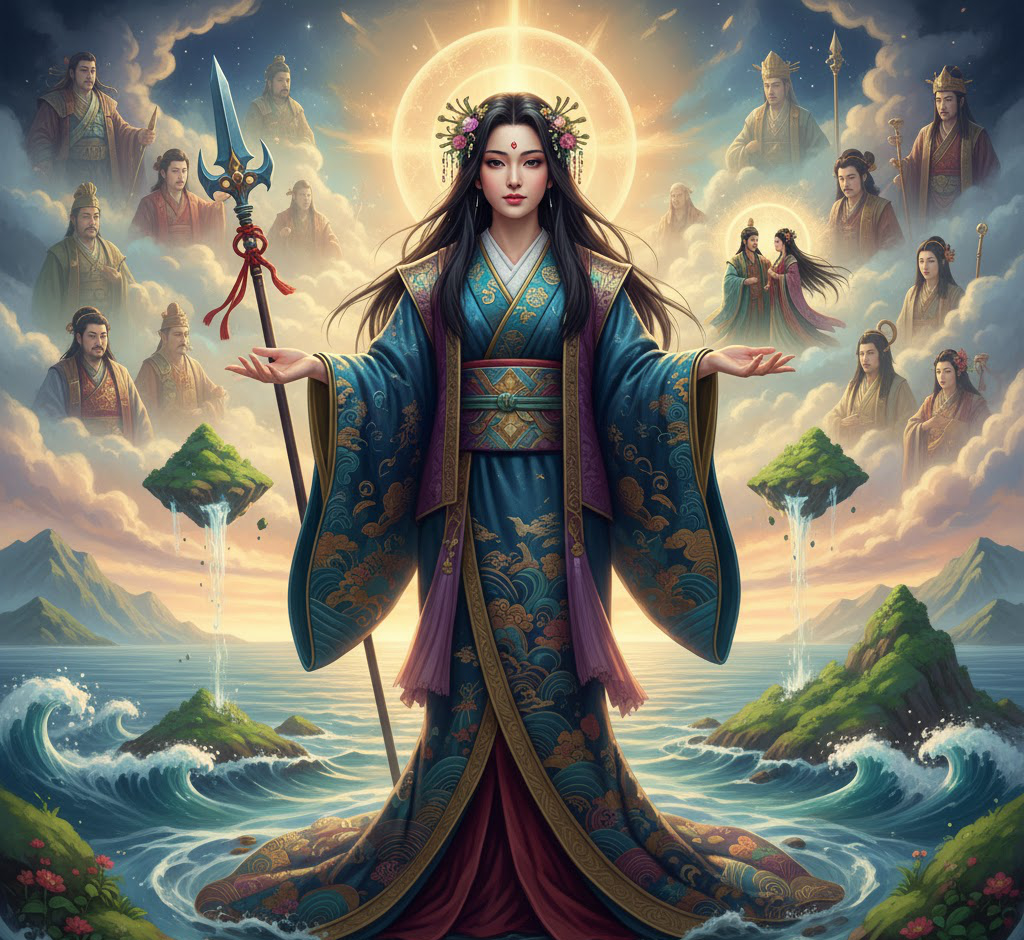 伊邪那美(イザナミ)はイザナギと共に天之御中主神(あめのみなかぬしのかみ)に大地を完成させるように命じられ、矛を使ってオノゴロ島を完成させ、大地に最初に降り立った神です。