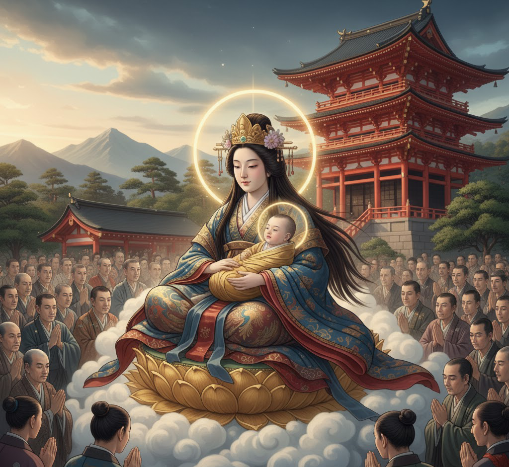 神功皇后(ジングウコウゴウ)は日本の代表的な聖母神で、処女のまま受胎て神の子を産むという母子神信仰と深く結びついている事で知られてます。また、鎌倉時代以降、全国的に広く信仰されるようになった応神天皇(八幡様)の母でもあります。