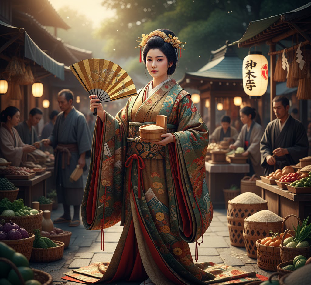 神大市姫(カミオオイチヒメ)は山の神の総元締として知られているオオヤマヅミの娘であり、お稲荷さんの名で親しまれているウカノミタマの母でもあるという女神です。カミオオイチヒメの名前の中にある「神大市」というのは「神々しい立派な市」と言う意味で市場の繁栄を担う神として古くから信仰を集めてきました。