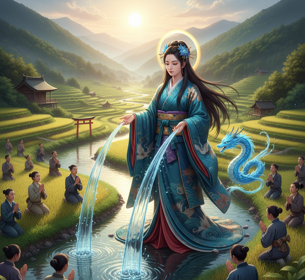 古代の日本においては水を多く使用する稲作が非常に重要であった事から日本神話には多くの水の神がでてきますが、タカオカミは特に雨乞いの神としての側面が強い女神で、稲作の水田に用いられる川の水を司る神だと言われています。