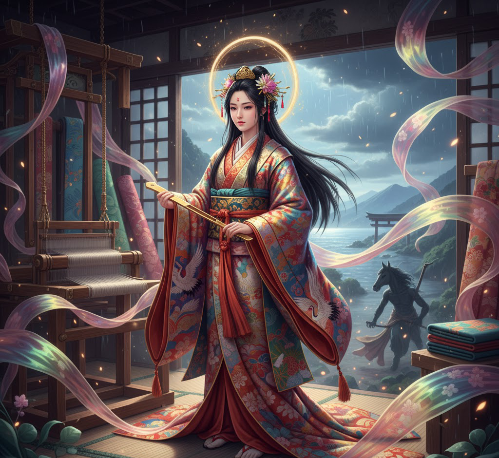 また、別の話ではアマテラスの着るものを織る為に機殿(はたどの)で仕事をしていると、三貴子の一柱であるスサノオが突然現れて斑馬の皮を剥ぎ、それを機殿の中に投げ込みます。